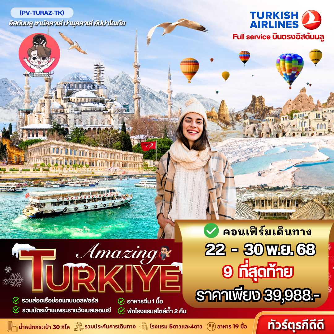 06.00 คณะพร้อมกัน ณ ท่าอากาศยานนานาชาติสุวรรณภูมิ กรุงเทพฯ ชั้น 4 เคาน์เตอร์เช็คอิน สายการบิน TURKISH AIRLINE โดยมีเจ้าหน้าที่ของบริษัทฯ คอยให้การต้อนรับ อำนวยความสะดวกตลอดขั้นตอนการเช็คอิน และ หัวหน้าทัวร์ให้คำแนะนำเพื่อเตรียมความพร้อมก่อนออกเดินทาง