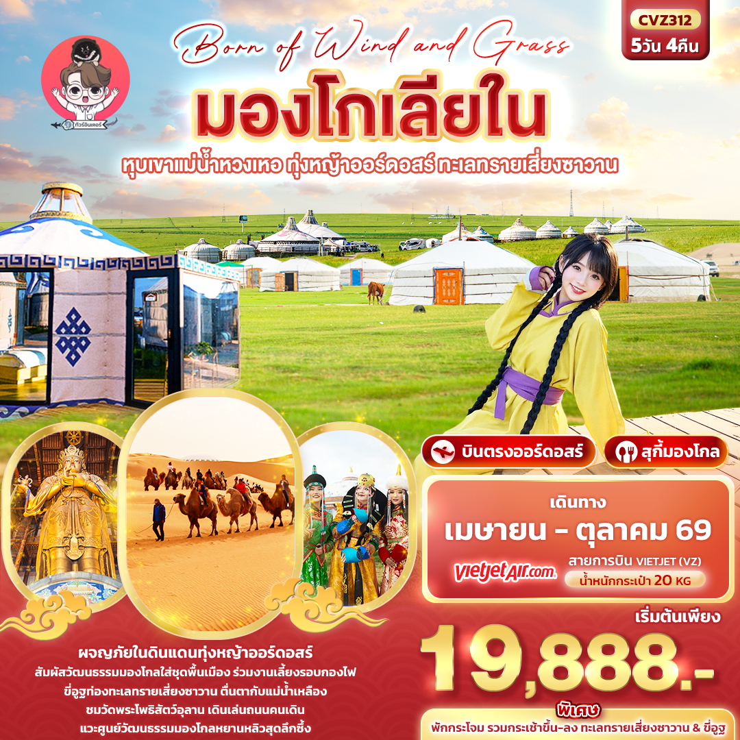 สักครั้งในชีวิต พิเศษ! สวมใส่ชุดมองโกล (ค่าทัวร์รวมค่าชุดมองโกล) เป็นพิธีพื้นบ้านและถือว่าเป็นสัญลักษณ์ของมิตรภาพ ความจริงใจ และความเคารพที่ชาวมองโกลมีต่อแขกผู้มาเยือน เป็นประสบการณ์ที่น่าจดจาอย่างยิ่ง
