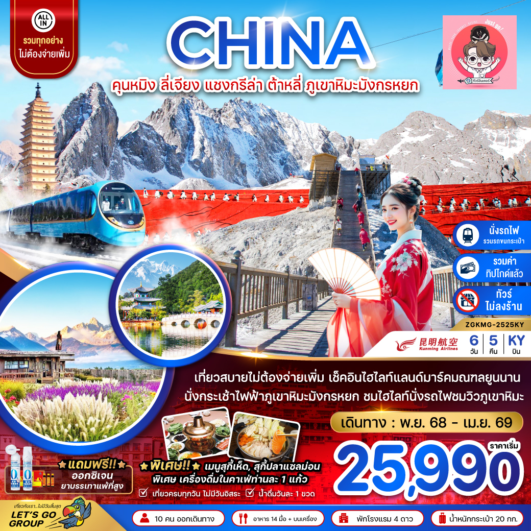 หน้าแรก / ทัวร์ทั้งหมด / CHINA คุนหมิง ลี่เจียง แชงกรีล่า ต้าหลี่ ภูเขาหิมะมังกรหยก