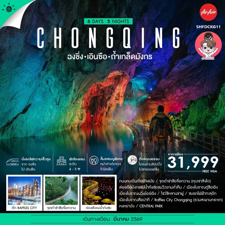 10.20 น. เดินทางถึง สนามบินเมืองฉงชิ่ง ตั้งอยู่ภาคตะวันตกของประเทศจีน ทั้งเป็นมหานครที่ใหญ่ที่สุดของประเทศจีน และเป็นศูนย์กลางของการคมนาคมทางบก ทางน้ำ จากนั้นนำท่านผ่านพิธีการตรวจคนเข้าเมืองและรับสัมภาระเรียบร้อยแล้ว นำท่านสู่ภัตตาคาร