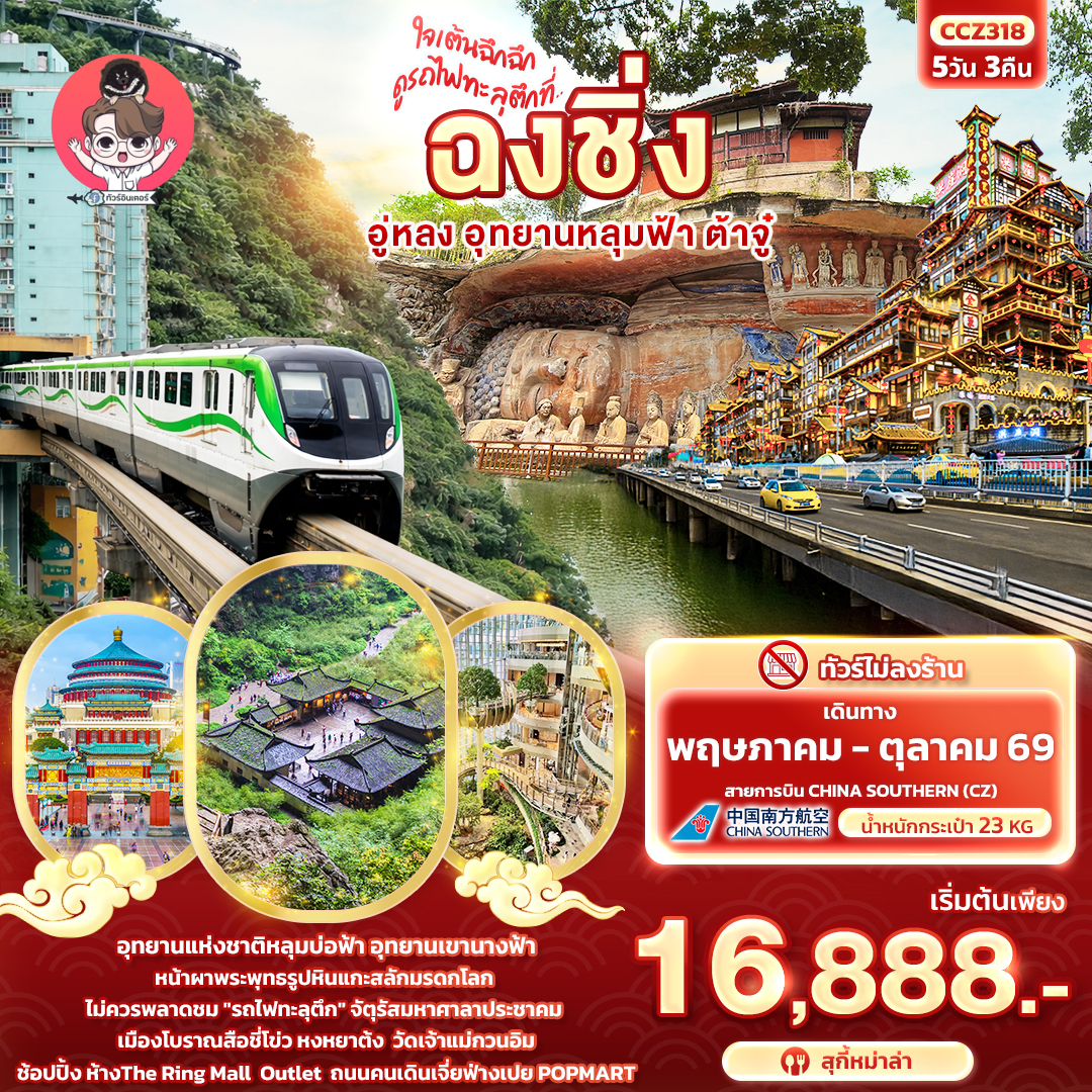 อู่หลง - เขานางฟ้า(รวมรถราง) – ฉงชิ่ง - รถไฟทะลุตึก – จัตุรัสมหาศาลาประชาคม – ถนนคนเดินกวนอินเฉียว