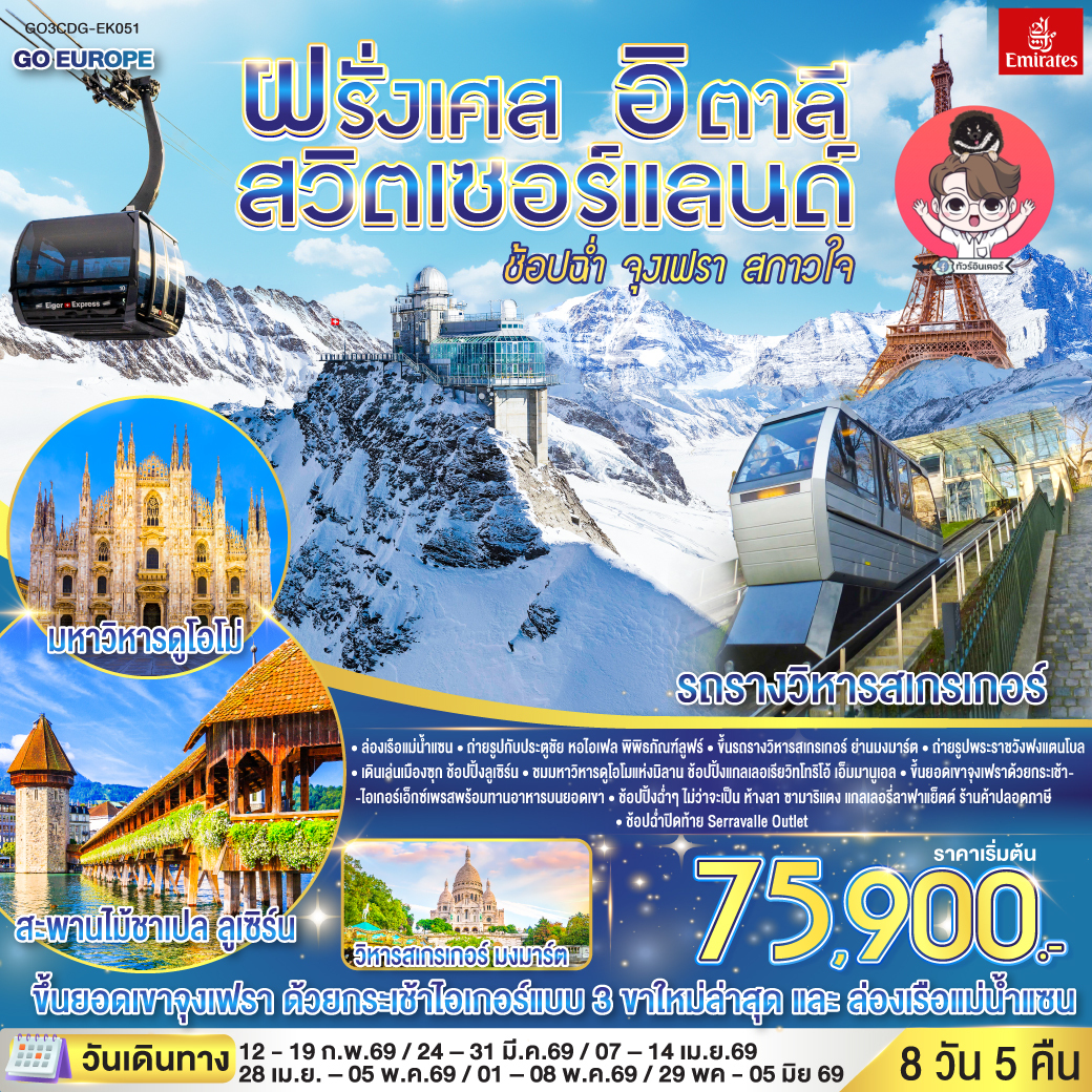 หน้าแรก / ทัวร์ทั้งหมด / ฝรั่งเศส อิตาลี สวิตเซอร์แลนด์ ช้อปฉ่ำ จุงเฟรา สกาวใจ