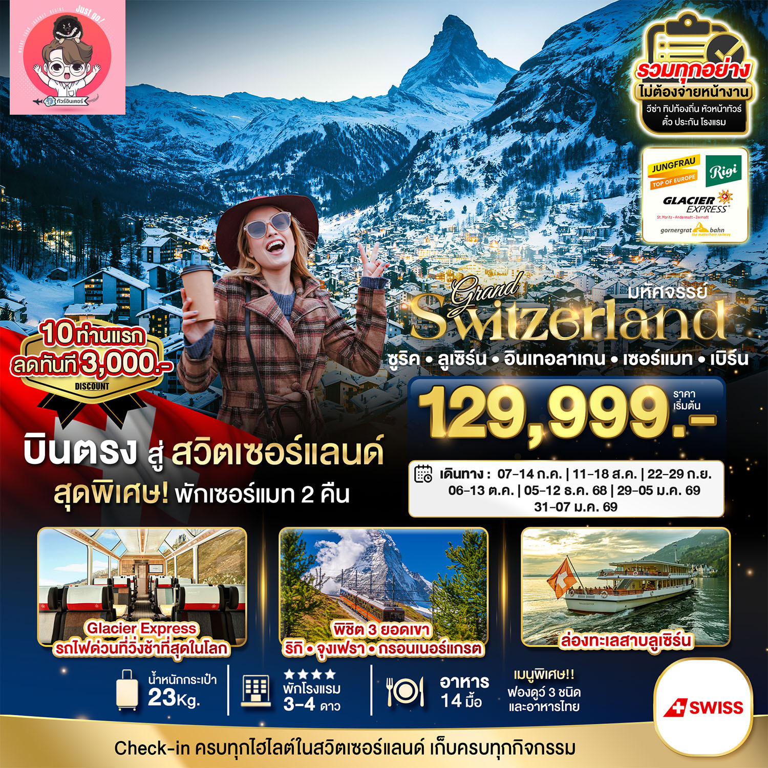 19.35 น. เดินทางถึงเดินทางถึง สนามบินซูริค ประเทศสวิตเซอร์แลนด์ (เวลาท้องถิ่นช้ากว่าประเทศไทย 6 ชั่วโมง) ไฟล์บินอาจมีปรับเวลาไม่มีผลต่อโปรแกรมเดินทาง ตรวจสอบไฟล์ทบินได้ตามตารางอัตราค่าบริการ