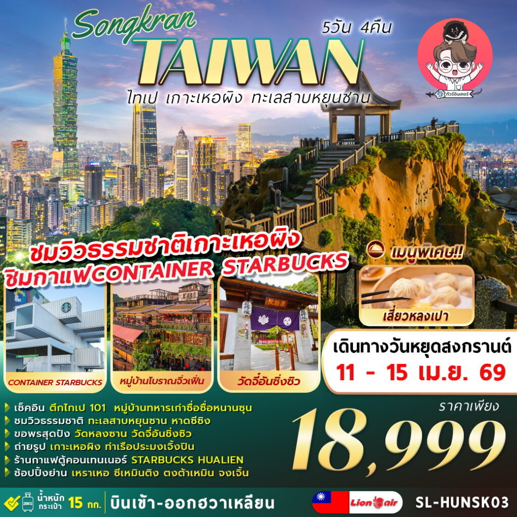 05.05 น. นำท่านออกเดินทางสู่สนามบินฮวาเหลียน โดยสายการบินไลอ้อน แอร์ เที่ยวบินที่ SL7330