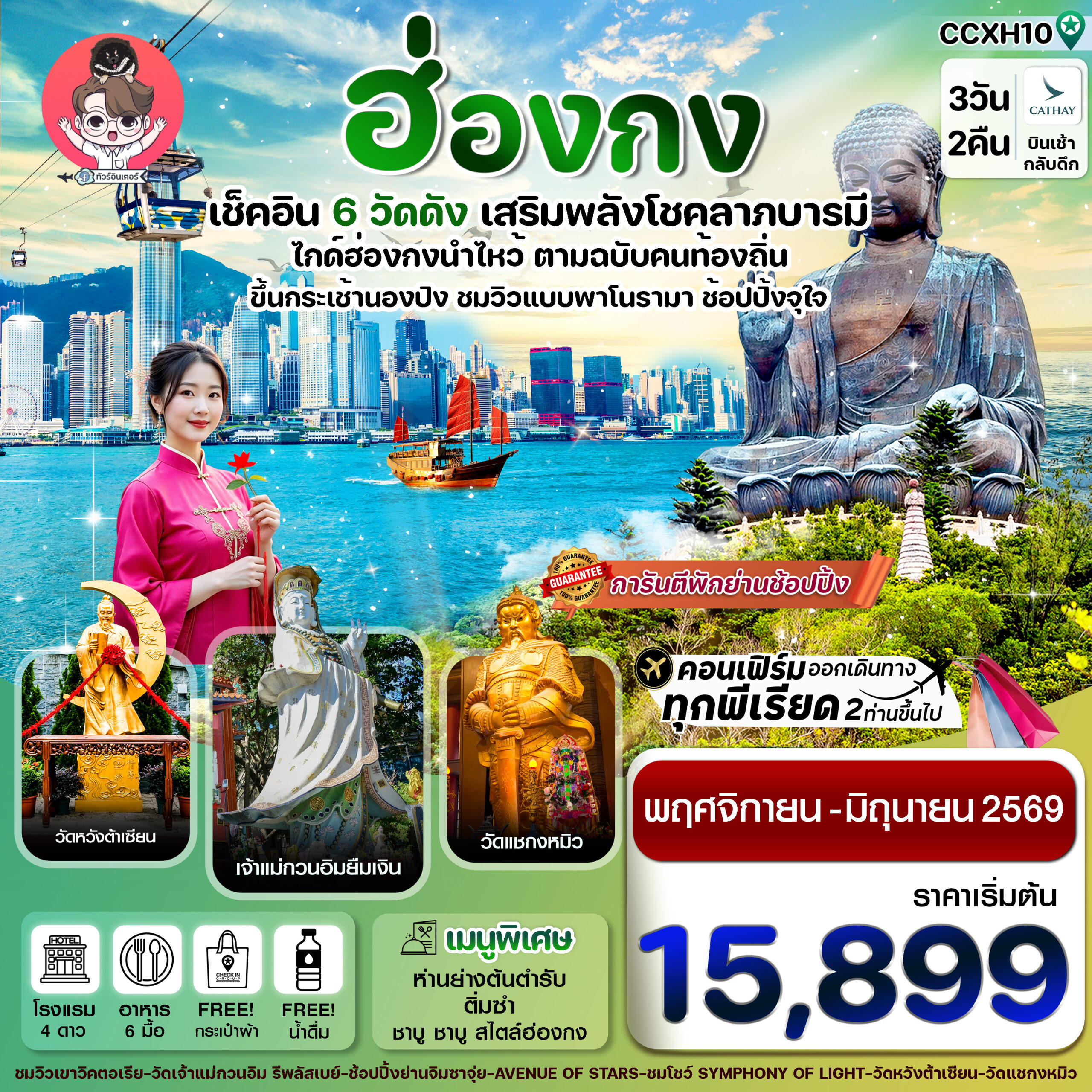 เจ้าแม่กวนอิม วัดฮองฮำ – โรงงานจิวเวลรี่ – ร้านหยก - วัดหวังต้าเซียน – วัดแชกงหมิว – ช้อปปิ้งย่านมงก๊ก – สนามบินฮ่องกง (เซ็กแล็บก็อก) - กรุงเทพฯ (สุวรรณภูมิ)