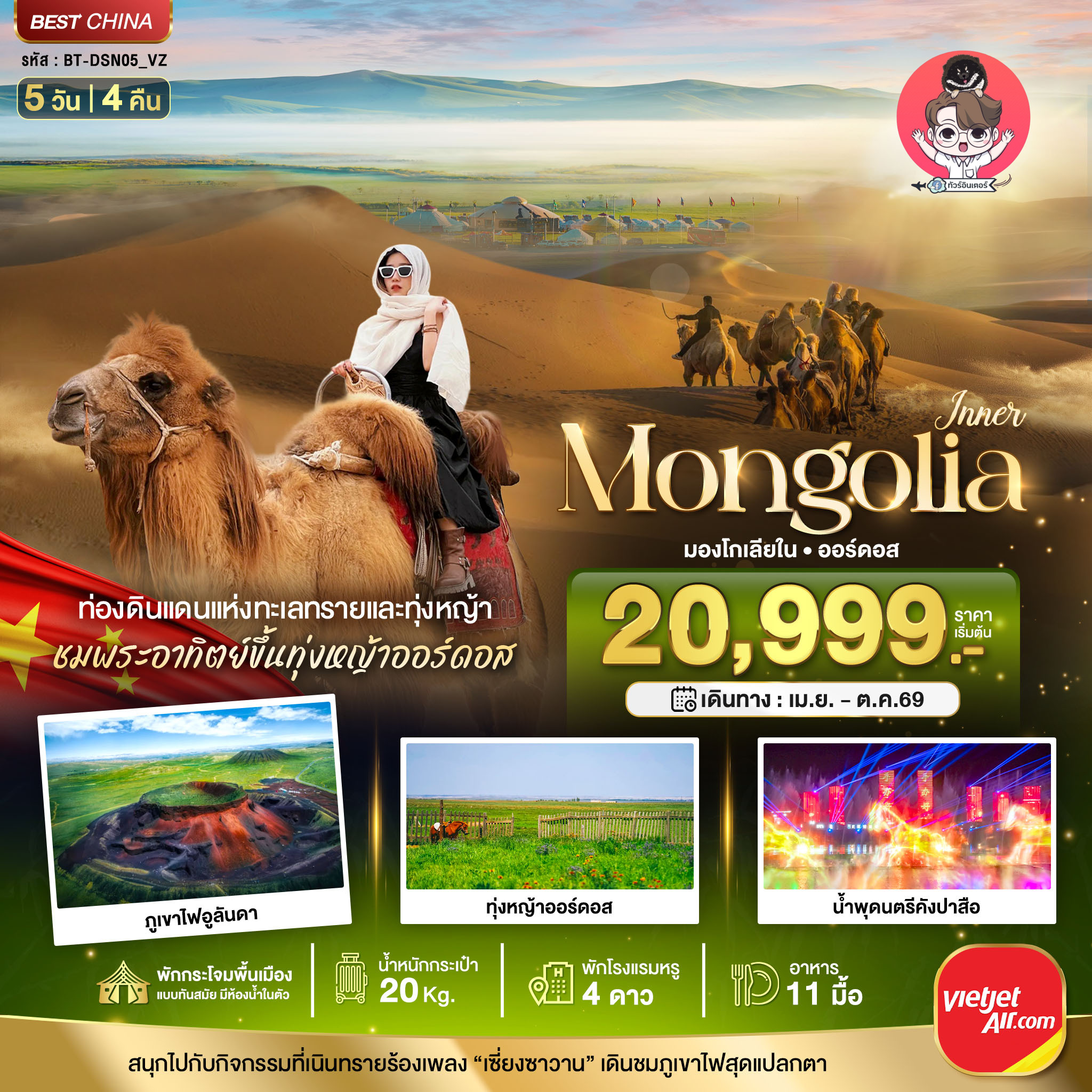 ชมพระอาทิตย์ขึ้น ณ ทุ่งหญ้าออร์ดอส์ • เนินทรายเสี่ยงซาวาน • ขี่อูฐตะลุยทะเลทราย • อิสระกิจกรรม ณ ทะเลทราย • เมืองออร์ดอส • ศูนย์ผลิตภัณฑ์เส้นใยขนอูฐ | เลือกซื้อออฟชั่นเสริม: เกาะเยว่ซา