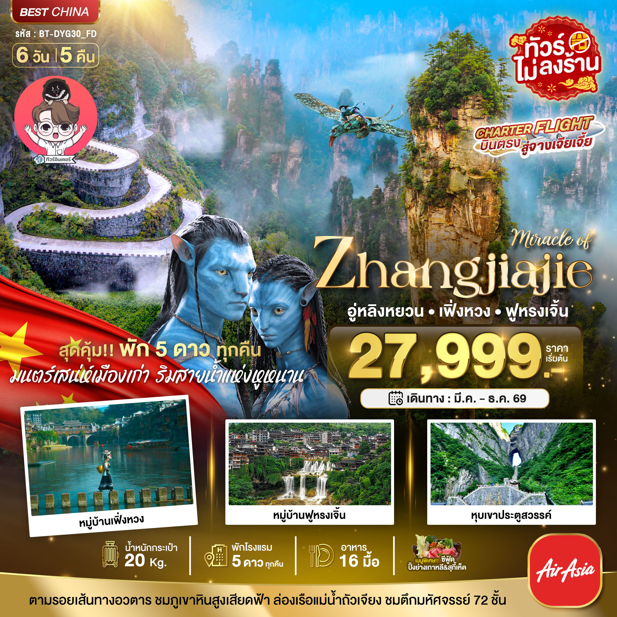 16.25 น. ออกเดินทางสู่ เมืองจางเจียเจี้ย ประเทศจีน โดยเที่ยวบินที่ FD789 (ไม่มีบริการอาหารบนเครื่อง)