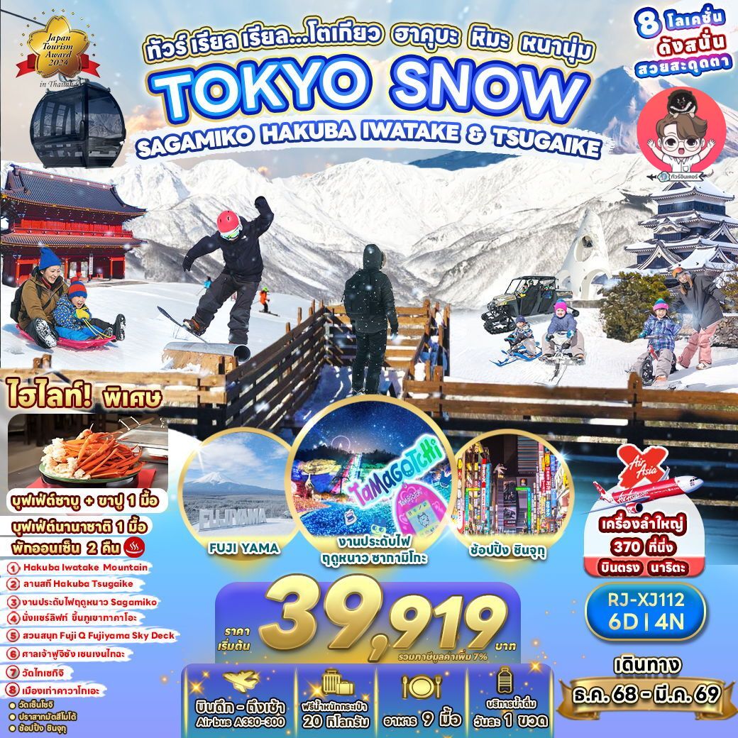 จากนั้นนำท่านสู่ ฮาคุบะ (Hakuba) ตั้งอยู่ทางตอนเหนือของจังหวัดนากาโน่ (Nagano) บนความสูงระดับ 3,000 เมตรของเทือกเขาแอลป์ตอนเหนือในฤดูหนาวนับเป็นสวรรค์ของนักสกี ถึงแม้จะเป็นเมืองไม่ใหญ่ แต่ก็มีสกีรีสอร์ทให้บริการสำหรับนักท่องเที่ยว และนักสกีเพียบพร้อมไม่แพ้ที่อื่นๆ นอกจากนั้นยังคงมีความงดงามของวิวทิวทัศน์ที่สวยงามในทุกฤดูกาลอีกด้วย จากนั้นนำท่านสู่ สถานีโนอาห์ อิวาทาเกะ กอนโดล่า ลิฟท์ (Noah Iwatake Gondola Lift) เพื่อขึ้นไปยัง Hakuba Iwatake Mountain Resort (รวมค่ากอนโดล่าลิฟท์) ใช้เวลาประมาณ 10 นาที เพื่อขึ้นไปยังด้านบนภูเขาอิวาทาเกะ ซึ่งมีความสูงกว่าระดับน้ำทะเล 1,100 เมตร หมายเหตุ การเปิดให้บริการของอิวาทาเกะกอนโดล่าขึ้นอยู่กับสภาพอากาศ โดยอยู่ในดุลพินิจของเจ้าหน้าที่ของอิวาทาเกะ กอนโดล่าเป็นสำคัญ ในกรณีที่กระเช้าปิดขอสงวนสิทธิ์ในการปรับเปลี่ยนโปรแกรมเป็นการขึ้นกระเช้าสถานีอื่นทดแทน ห้ามพลาดกับการ ชมวิวแบบพาโนรามา ณ Hakuba Mountain Harbor ด้วยทัศนียภาพที่เหนือชั้นของวิวทิวทัศน์ของเทือกเขาฮิดะ หรือเทือกเขาเจแปนแอลป์ตอนเหนืออันสวยงามตระการตา จุดเด่น คือ ระเบียง “Hakuba Sanzan” ที่สามารถเห็นเทือกเขาแอลป์แบบ 360 องศา ได้อย่างสวยงามในทุกฤดูกาล อีกทั้งสามารถยืนถ่ายรูป และดื่มด่ำกับบรรยากาศได้อย่างเต็มอิ่ม ในบริเวณเดียวกันที่มี ร้านเบเกอรี่ The City Bakery (ไม่รวมค่าอาหารและเครื่องดื่ม) โดยทางเข้ามีที่นั่งบนระเบียง สามารถเพลิดเพลินไปกับการจิบเครื่องดื่มอุ่นๆ พร้อมชมบรรยากาศตามอัธยาศัย นอกจากนี้ยังมี Yoo-Hoo! SWING ชิงช้าลอยฟ้าขนาดใหญ่ที่สามารถชมวิวสวยๆ ไปพร้อมกับแกว่งชิงช้าแบบหันหน้าเข้าหาธรรมชาติบนเทือกเขาสูง (ราคาทัวร์ไม่รวมค่าชิงช้า) นอกจากนั้นท่านยังสามารถนั่งกระเช้าห้อยขา Ski lift เพื่อลงไปยังฮาคุบะ ฮิโตโตคิ โน โมริ (Hakuba Hitotoki no Mori) ลานบริเวณกว้างที่มีร้าน ชาเขียวรสชาติดี CHAVATY HAKUBA ร้านคาเฟ่บรรยากาศดีอีกแห่งนึงคอยให้บริการท่าน พลาดไม่ได้กับเครื่องเล่นที่จะให้ท่านได้เห็นทัศนียภาพที่สวยงามพร้อมทั้งความตื่นเต้นกับ Hakuba Giant Swing ชิงช้าขนาดใหญ่สูงเหนือพื้น 10 เมตร สามารถเหวี่ยงตัวไปข้างหน้าได้สูงสุดประมาณ 6 เมตร รอให้ท่านได้สัมผัสกับความตื่นเต้นเร้าใจ หมายเหตุ การเปิดให้บริการของชิงช้าขึ้นอยู่กับสภาพอากาศเป็นสำคัญ จากนั้นอิสระให้ท่านใช้เวลาเก็บภาพความสวยงามของเทือกเขาแอลป์ ** พีเรียดการเดินทางวันที่ 14-19 ธันวาคม 2568 และ 15-20 ธันวาคม 2568 **