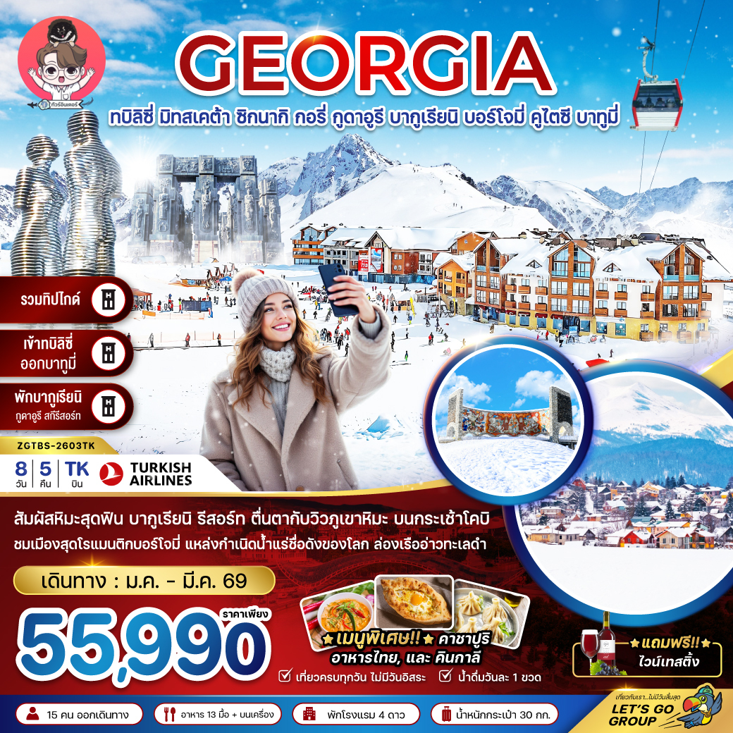 เมืองบอร์โจมี่ – สวนบอร์โจมี่ – นั่งกระเช้าไฟฟ้า – เมืองคูไตซี – น้ำพุกลางเมืองโคลคิส – วิหารบากราติ – เมืองบาทูมี่ – แกรนด์ ช้อปปิ้ง มอลล์
