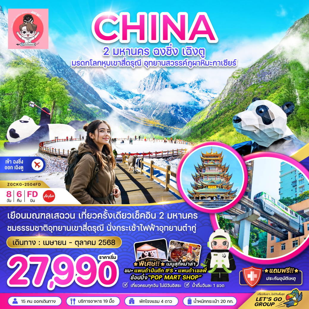นำท่านเดินทางสู่ เมืองเฉิงตู เมืองแห่งแพนด้าและวัฒนธรรมเสฉวน เฉิงตู เมืองเอกของมณฑลเสฉวน โดดเด่นด้วยบรรยากาศผ่อนคลาย อาหารรสจัดจ้าน และเสน่ห์ทางวัฒนธรรม ที่นี่เป็นบ้านของศูนย์อนุรักษ์แพนด้ายักษ์ สัตว์ประจำชาติของจีน (ใช้เวลาเดินทางประมาณ 3-4 ชั่วโมง)